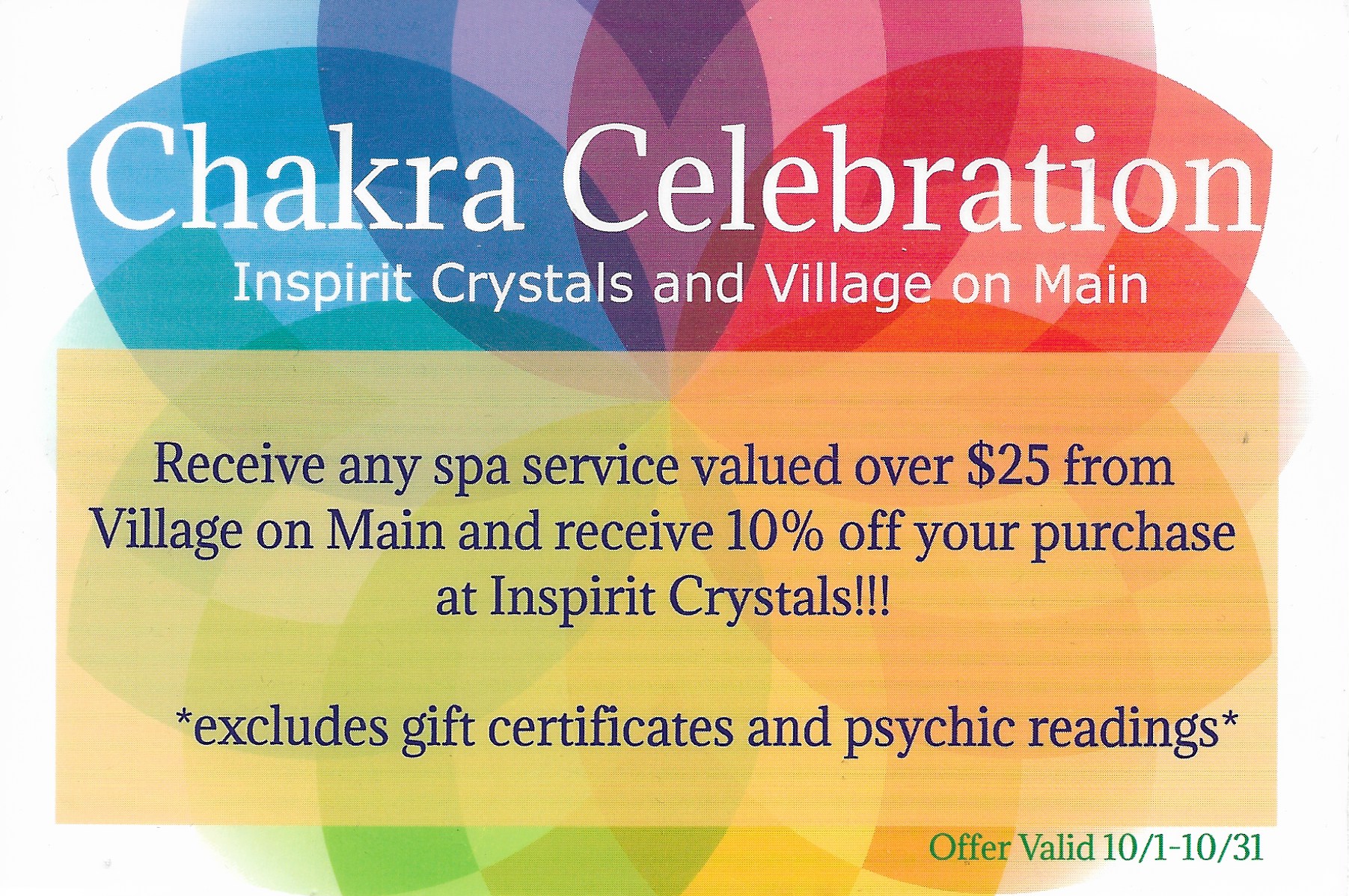Inspirit Crystals and Village on Main have teamed up for a Chakra Celebration! Spend $50 at Inspirit Crystals and get 20% off a Chakra Balancing Facial, Chakra Balancing Session or Reiki Healing Session! Purchase any spa service valued over $25 and get 10% off your purchase at Inspirit Crystals.